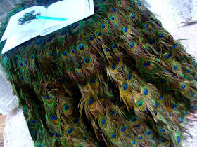 beautiful peacock feather tablecloth. Notice the feathered pen that provides