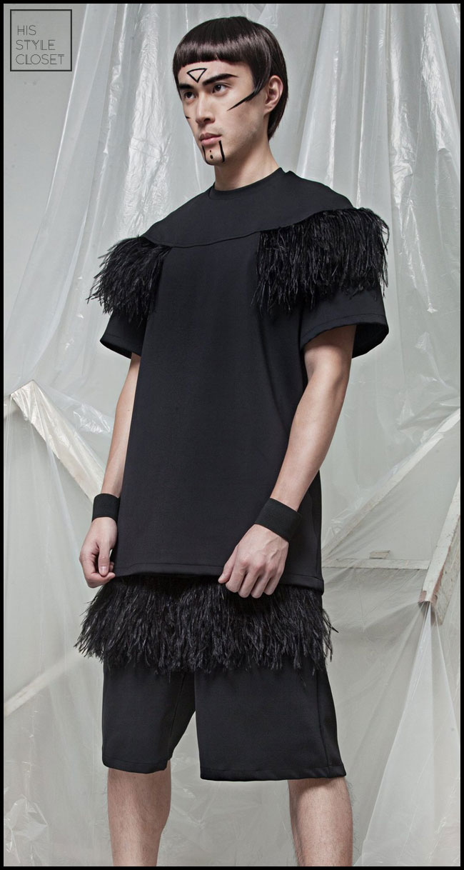 Dark and sporty with feather trim, this new designer is most definitely something different.