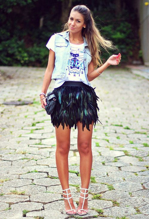 This black ruffled feather skirt and leather jacked are perfect for clubbing.