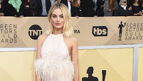 Margot Robbie at the 2018 SAG Awards wearing a simple, yet beautiful white dress, decorated with white feathers around the waist.