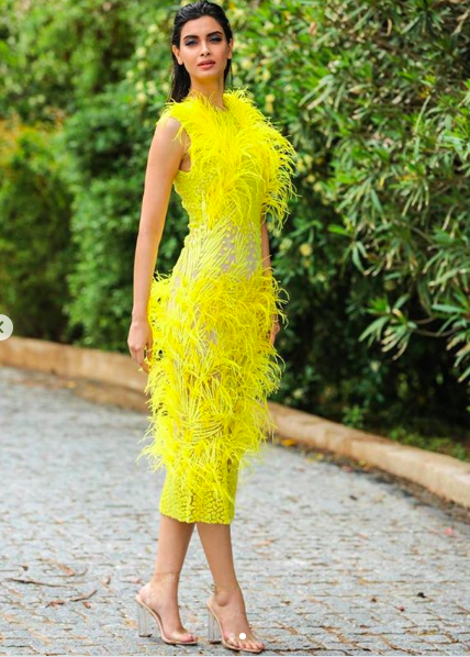 Diana Penty wears a Atelier Zuhra dress with feather embelishment.